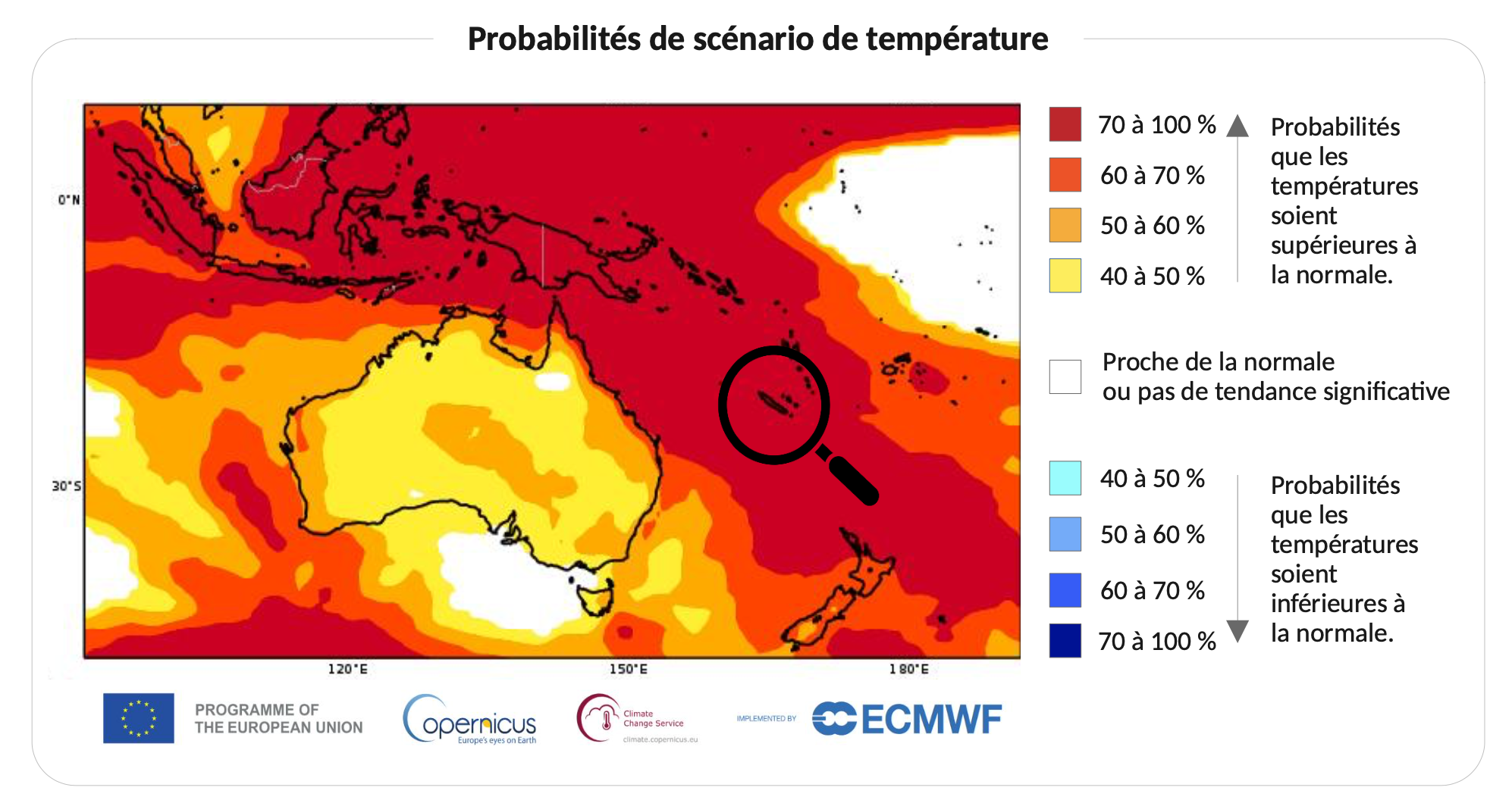 Les températures devraient être supérieures aux normales avec une probabilité de 80 %. Les valeurs de référence rappellent la réalité du climat calédonien :