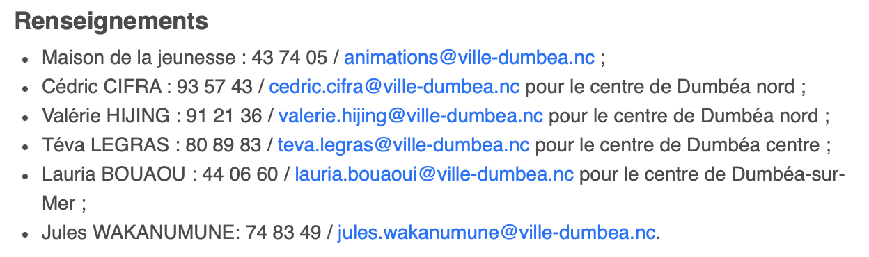 Des référents sont également identifiés selon les secteurs de Dumbéa Nord, Dumbéa Centre et Dumbéa-sur-Mer.