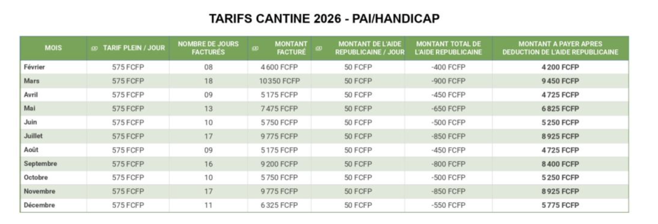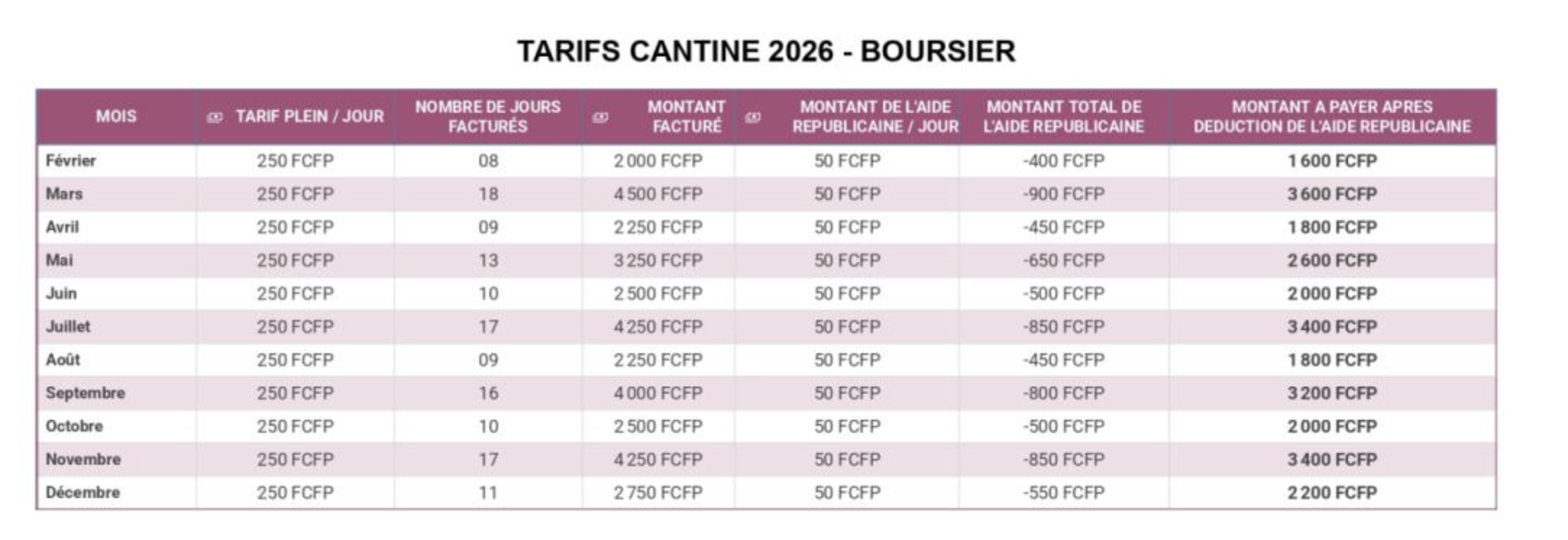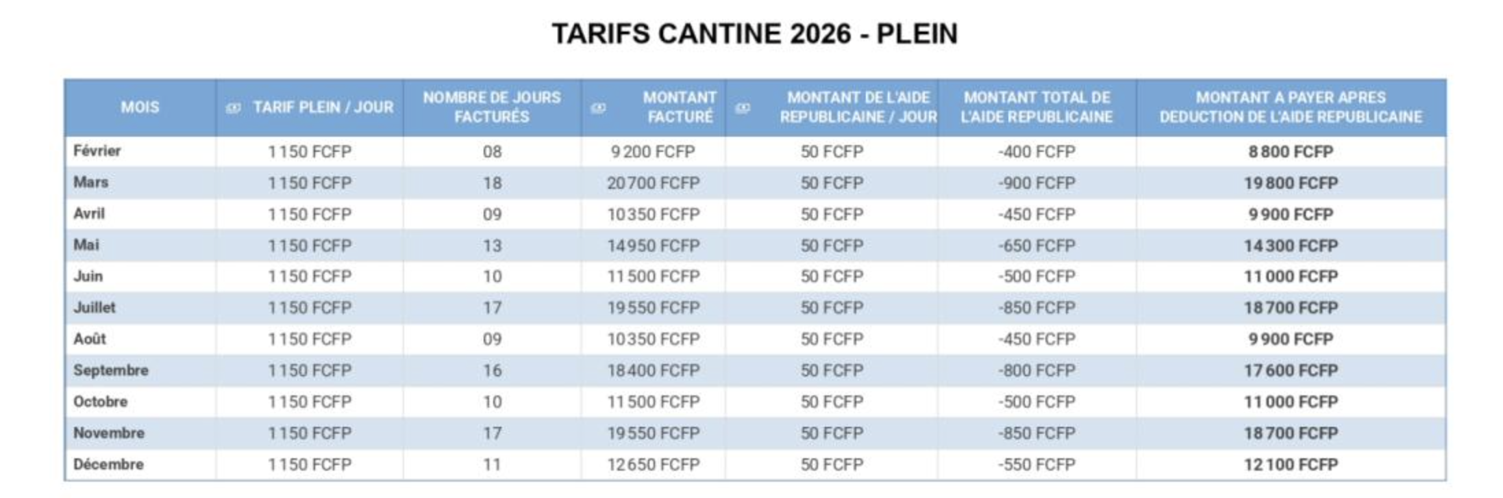 Le tarif 2026 est fixé à 1 150 francs par jour, avec des tarifs réduits pour les familles bénéficiant d’aides (bourse, Cafat), sur justificatif. Les enfants en situation de handicap ou sous PAI panier-repas bénéficient d’une réduction de 50 %.